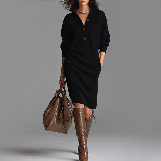 Slim Fit Ribbed Collared Midi-Length Sweater Dress for Women – Cozy & Stylish Design