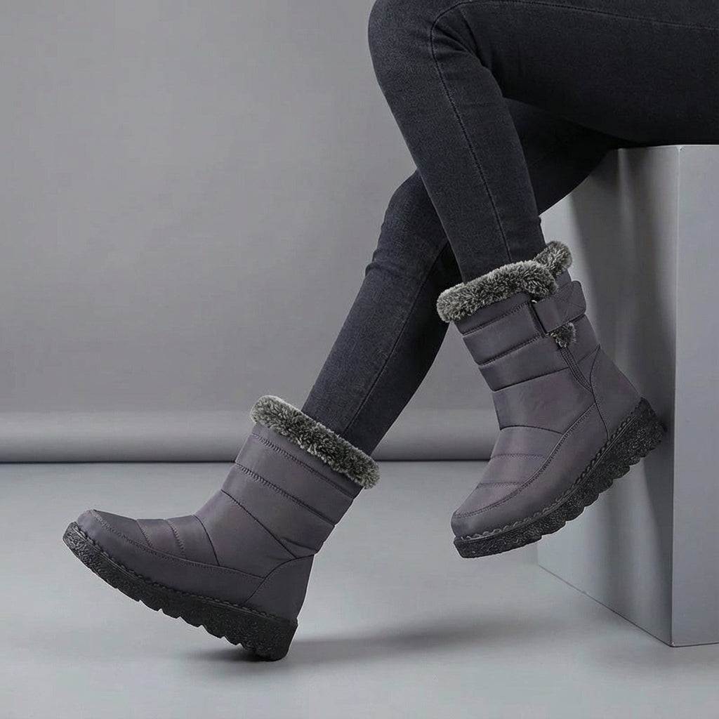 - Style Type: Snow Boots, Quilted, Fur Trim, Adjustable Strap, Treaded Sole